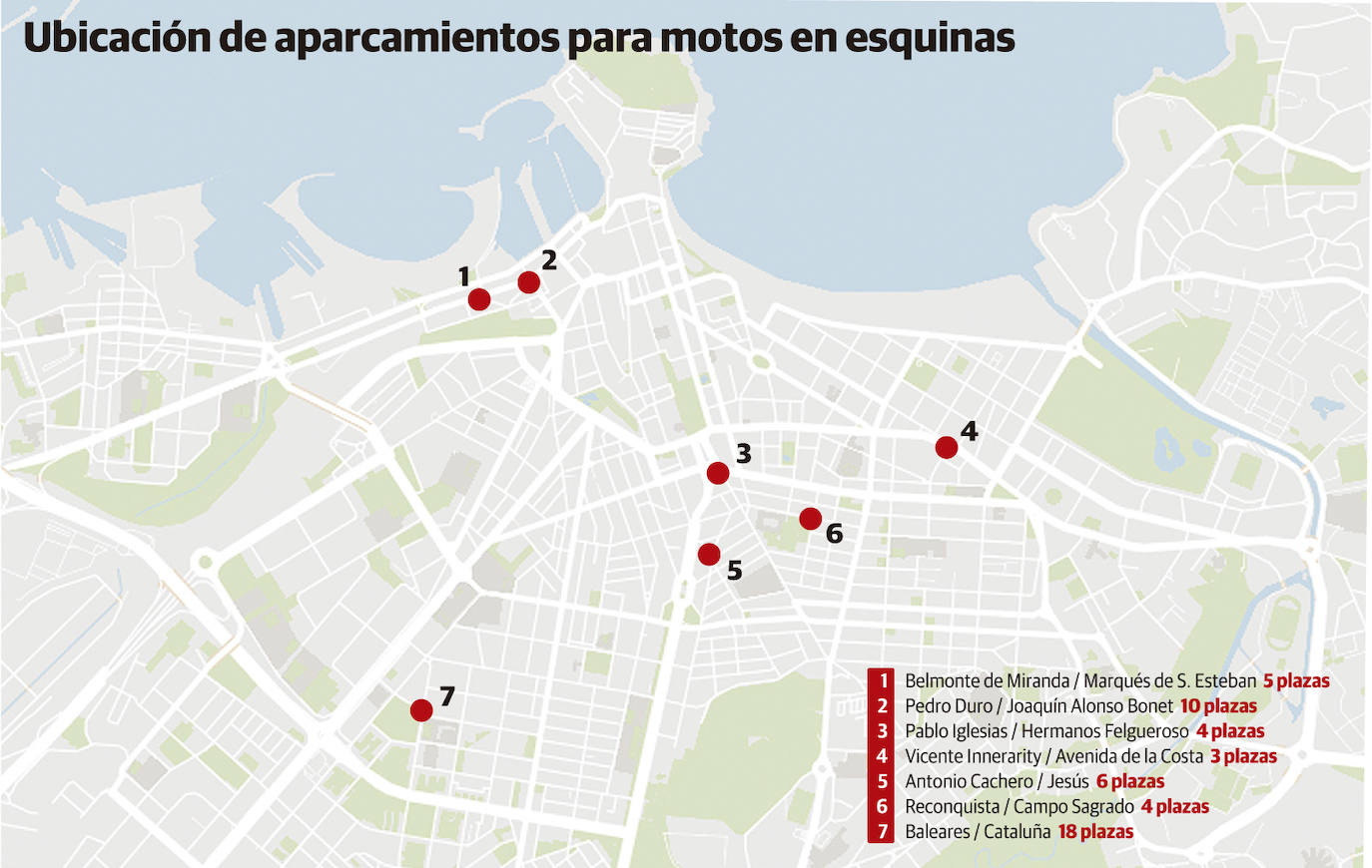 Como «proyecto piloto», pero con la intención de «ir extendiéndolo por toda la ciudad», se han empezado a pintar plazas en esquinas de calles y chaflanes «que no tenían ningún uso». En concreto se han elegido siete puntos, en los que se creará aparcamiento para 50 motos. Seis ya están pintados: en la esquina de Pedro Duro con Joaquín Alonso Bonet y Marqués de San Esteban; en Marqués de San Esteban con Belmonte de Miranda; en Pablo Iglesias con Hermanos Felgueroso; en Antonio Cachero con Jesús; en Reconquista con Campo Sagrado y en Baleares con Cataluña. En breve se sumará el cruce entre Vicente Innerarity y la avenida de la Costa.