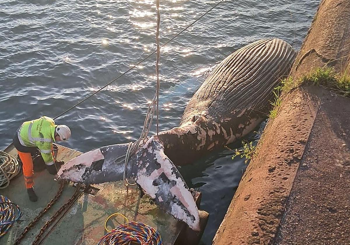 Retiran la ballena de más de cinco toneladas que apareció muerta en la costa de Gijón