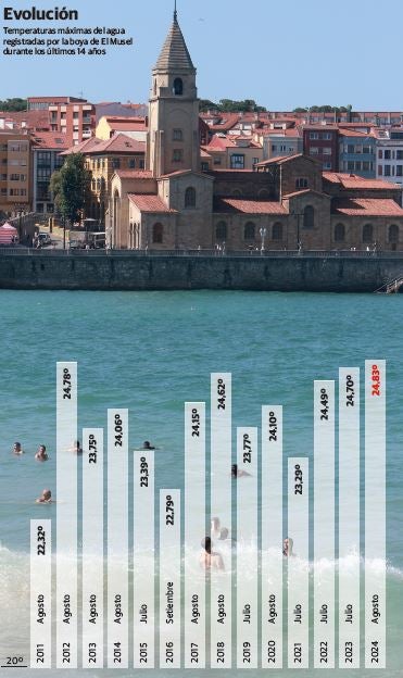 La boya de Puertos del Estado en Gijón, ubicada en el exterior del puerto de El Musel, junto a la ampliación, registró el martes una temperatura de 24,83 grados, máximo histórico registrado en la bahía de gijonesa desde 2004, fecha en la que se instaló la boya. Ya el 31 de julio se había alcanzado un nuevo pico de temperatura con 24,75 grados.