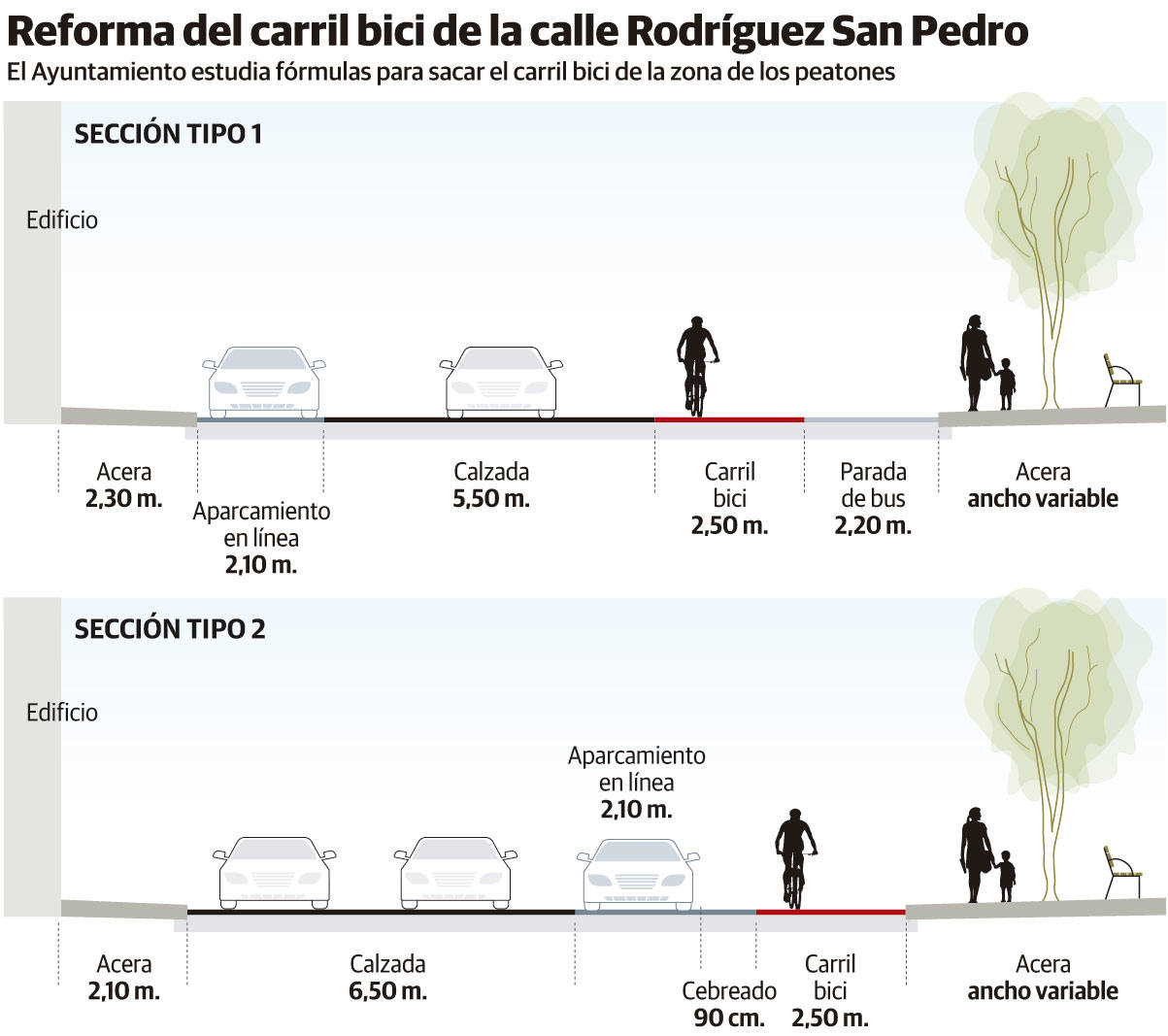 El carril bici de Rodríguez San Pedro discurre sobre el paseo peatonal, con puntos especialmente conflictivos como su paso junto a las 'Letronas', donde es habitual que los turistas se paren sobre la zona reservada a los ciclistas para sacar fotos, y el tramo que va en paralelo a la zona elevada del paseo del muelle -desde Pedro Duro hasta Motonáutica-, de uso compartido para bicicletas y peatones, con prioridad para estos últimos. Si bien el gobierno asegura que trabajará «sin apriorismos», sí tiene clara la necesidad de «segregar» el carril bici de la parte peatonal, lo que pasaría por un nuevo trazado que ocupe parte de las actuales plazas de aparcamiento, sustituyendo las que están en batería por otras en línea. El objetivo es poder ejecutar también en 2024 esta obra, que el Ayuntamiento ve como una solución «provisional» hasta que en un futuro se remodele toda la fachada marítima.