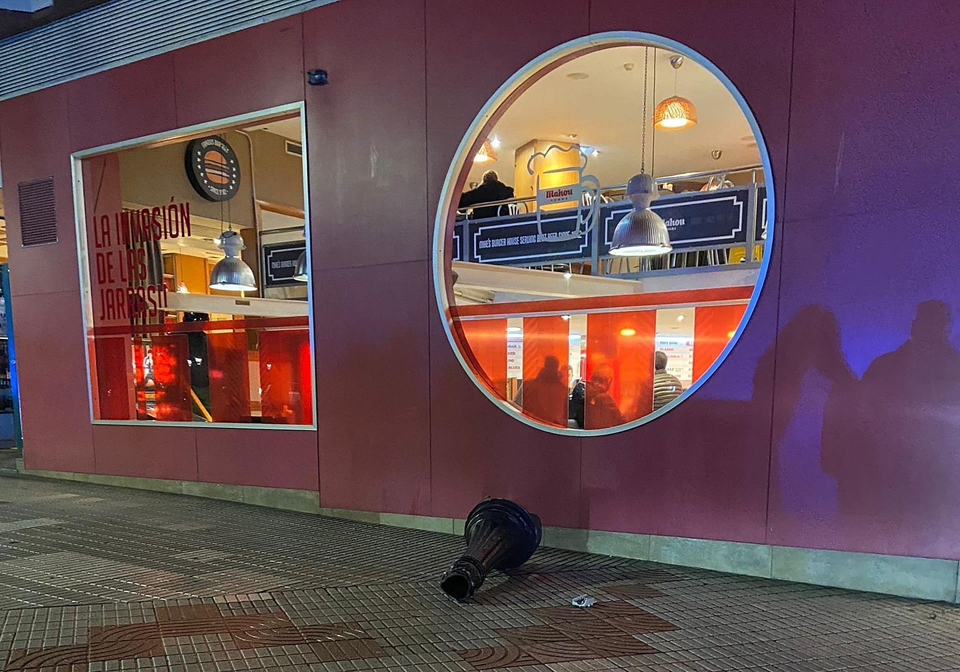Un coche derriba una farola que impacta contra una hamburguesería en Gijón