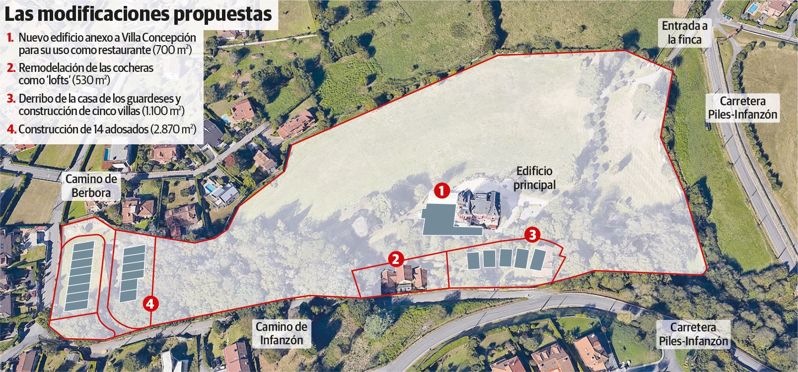 Las antiguas cocheras, en la zona de la parcela colindante con el camino del Infanzón, se rehabilitarán y se compartimentarán para convertirse en cuatro viviendas «tipo 'loft'». Y en ese mismo entorno se derribará la antigua casa de los guardeses, «en estado ruinoso» para dejar sitio para la construcción de cinco viviendas unifamiliares «tipo villas» de hasta 220 metros cuadrados cada una. Por otra parte, en la zona de la finca colindante con el camino de Berbora, donde se ubicaba el frontón, el proyecto plantea construir 14 viviendas adosadas (un bloque con ocho y otro con seis, separados por un vial de acceso a las mismas).