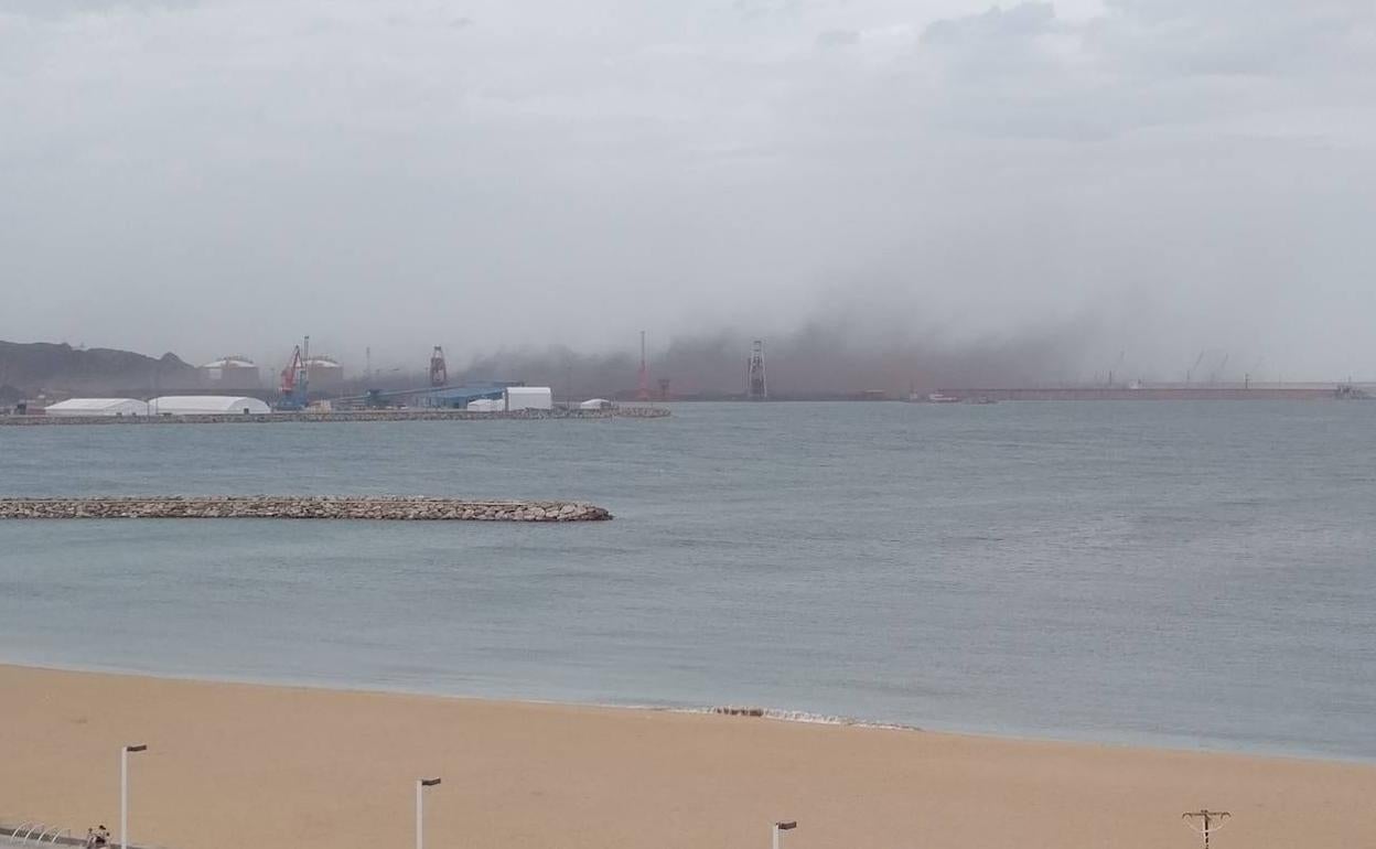 Fuertes rachas de viento provocan una nube de polvo de carbón en El Musel