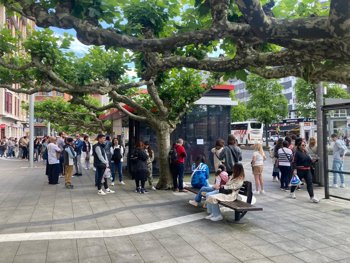 Emtusa ha habilitado hasta cinco autobuses articulados lanzadera. A primera hora de la tarde se ha producido una larga cola que esperaba la llegada de un autobús que, según el propio conductor, se retrasó por el tráfico en la ciudad.