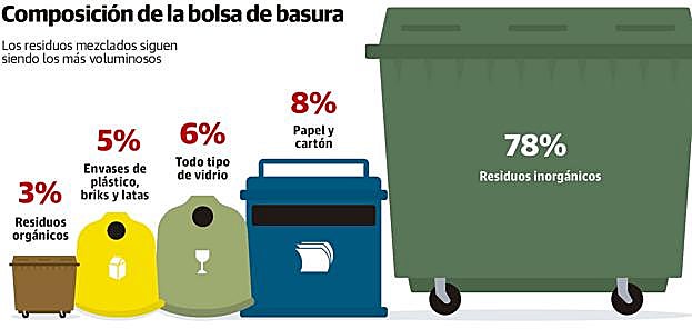 La composición de la bolsa de basura de los gijoneses está compuesta fundamentalmente por residuos mezclados, pues llegan al 78%, mientras que el papel y cartón supone el 8%, el vidrio el 6%, los envases el 5% y los residuos orgánicos el 3%.