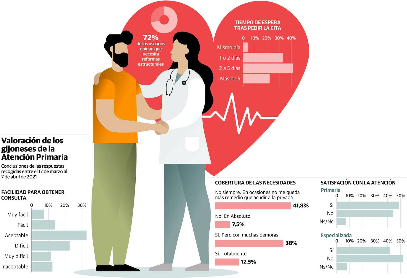 La pandemia del coronavirus ha puesto todo patas arriba, en especial la atención sanitaria. El modelo de cita previa que hasta marzo de ... 2020 imperaba en Asturias, con centros de salud a los que se podía acudir simplemente pidiendo consulta por teléfono, por internet o yendo personalmente, saltó por los aires al restringirse, y mucho, las citas presenciales. Las restricciones en el acceso a la Atención Primaria, donde la mayor parte de las consultas pasaron a ser telefónicas y la atención de tarde se concentró en cuatro centros (antes eran siete), fueron comprendidas en los primeros tiempos de la pandemia pero a medida que los meses pasaban y las dificultades para poder consultar con el médico o la enfermera se acentuaban, la disconformidad de los pacientes creció. En mayo de este año, una vez que se levantó el estado de alarma y antes de que estallara la cuarta ola de la covid en Asturias, la Federación de Vecinos (FAV) de Gijón comenzó a solicitar la vuelta a la presencialidad completa en Primaria y la recuperación del modelo de atención continuada (de 15 a 20 horas) que los centros de salud brindaban antes de la pandemia. Es decir, que las urgencias en Primaria y el servicio vespertino volviera a ofrecerse en los equipamientos de El Natahoyo, Severo Ochoa, Contrueces, El Coto, Laviada, Perchera y Roces-Montevil en lugar de concentrarlos solo en La Calzada, Puerta de la Villa, El Parque-Somió y El Llano.