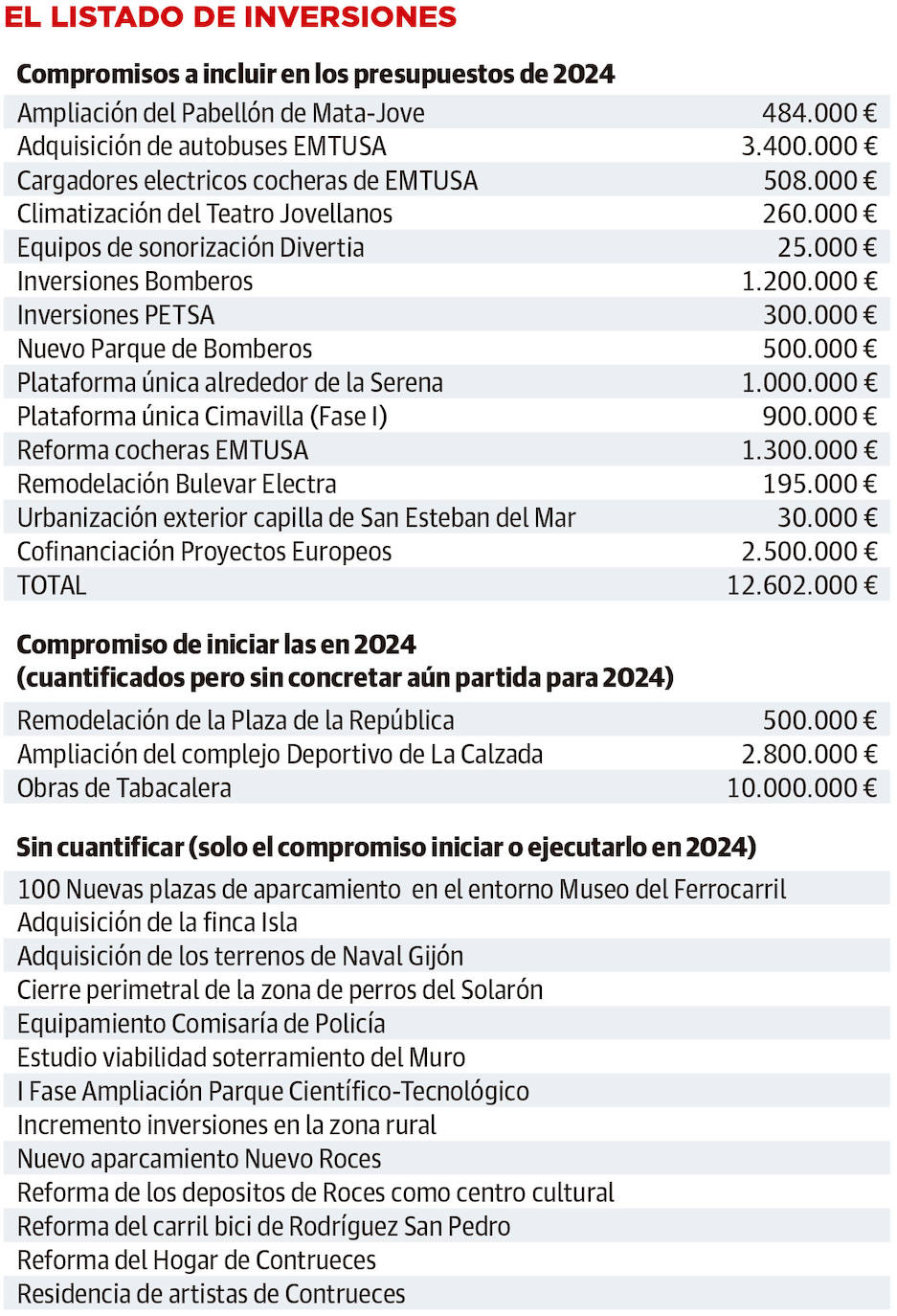 Además están las inversiones que vienen contempladas en los presupuestos de las empresas municipales pero que paga el Ayuntamiento. Ya se han conocido (y aprobado en su consejo) la de Divertia -equipos de sonorización por 25.000 euros y la climatización del Jovellanos que serán 260.000- y las de Petsa, que suman 300.000 euros. Las inversiones de la EMA, que serán millonarias, no tienen reflejo en el presupuesto municipal.