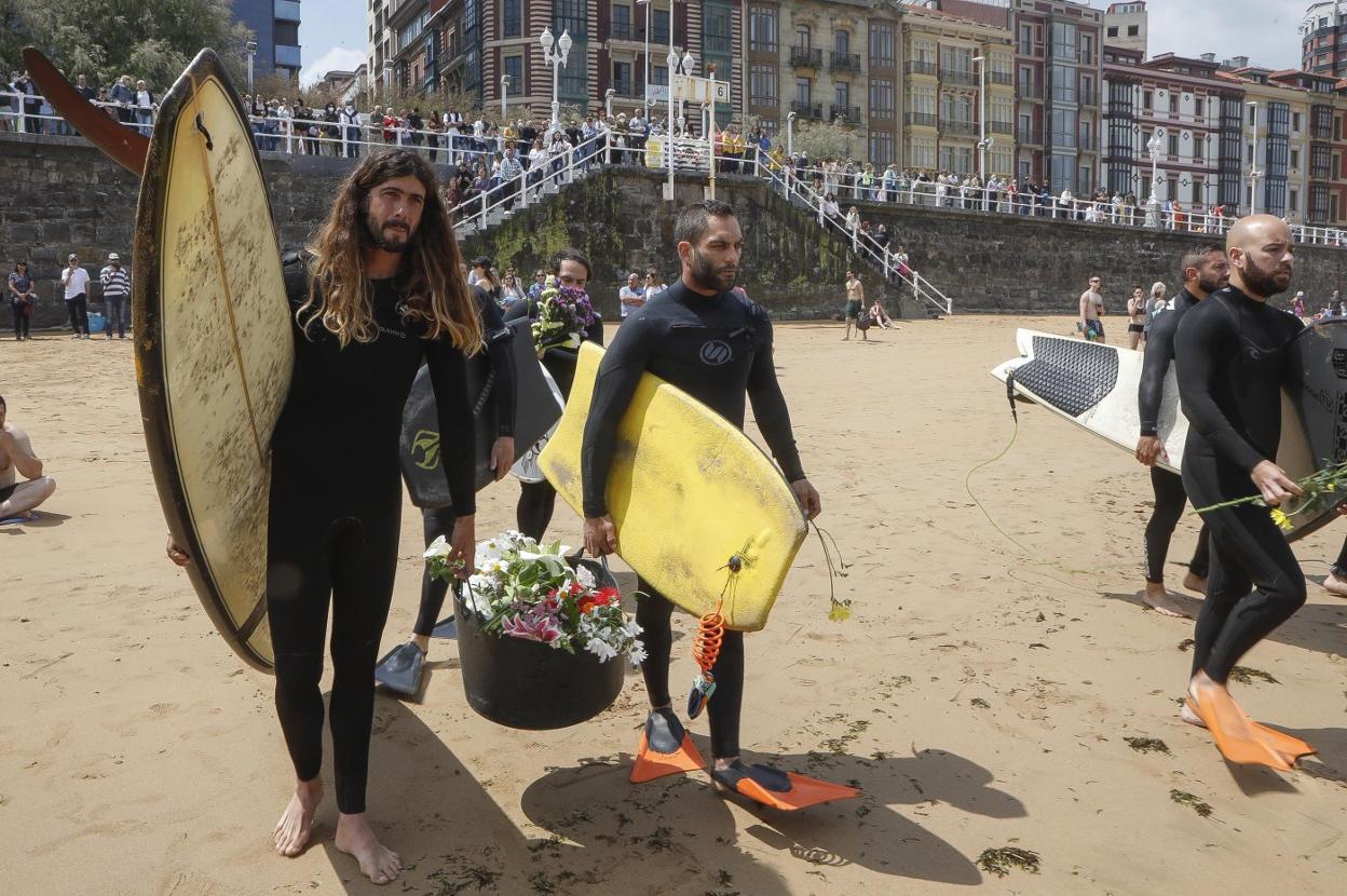 Cargados de flores, los amigos surfistas de Joel Rionda Granjo (Gijón, 1987), el joven fallecido en un accidente de moto en Sri Lanka, se adentraron ayer con sus tablas en las aguas de la bahía de San Lorenzo, formaron un círculo y rindieron tributo a la vida y el legado de Joel. «Tenemos que estar alegres porque Joel vivió siempre como quiso. Fue un espíritu libre, siempre decía lo que pensaba y te hacía estar cerca de él», dijo Iván Costales, uno de los organizadores del 'paddle out', como se conoce a este ritual de origen hawaiano.