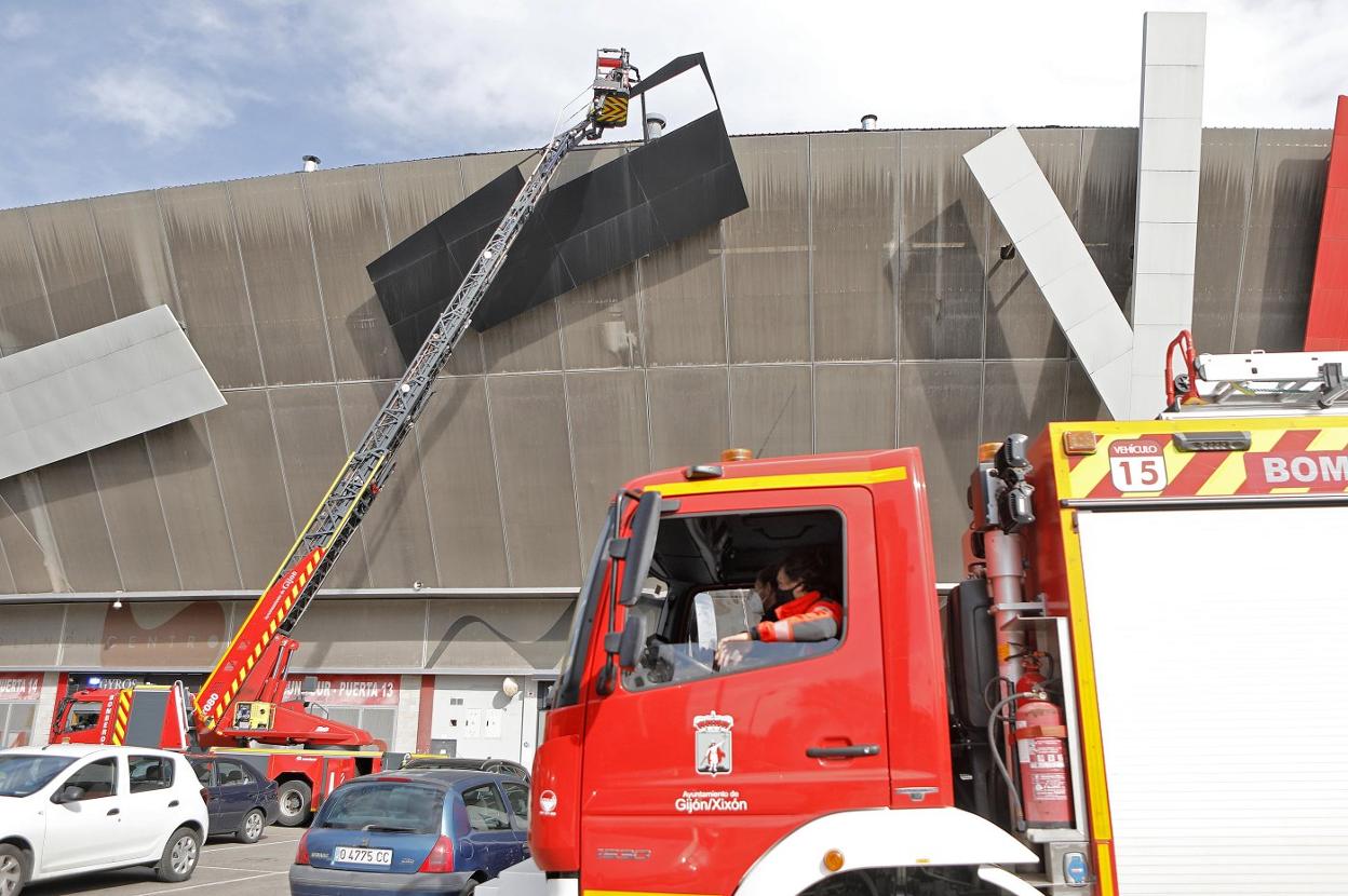 Los fuertes vientos que trajo ayer por la mañana el temporal 'Karim' provocaron al menos 22 salidas a lo largo de la jornada por diversos incidentes, la mayoría por árboles atravesados o ramas semi caídas. La actuación más llamativa se produjo en el estadio de El Molinón, con el desprendimiento de una de las placas de la fachada oeste. Aunque no hubo que lamentar heridos ni daños personales, debió utilizarse una grúa de grandes dimensiones para operar en la placa.