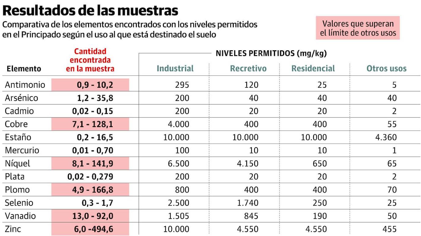 El carbón que regularmente tiñe San Lorenzo aparece en menor cantidad en Poniente y El Arbeyal. En los tres llega con más renio, selenio y mercurio del que en condiciones normales presenta la corteza terrestre. Las concentraciones están por debajo de las máximas fijadas por el Principado para suelos industriales, recreativos y residenciales, sin que hasta el momento se hayan establecido topes para playas. Las manchas sí están más enriquecidas en cobre, niquel, plomo, zinc y antimonio de lo que la norma regional establece para suelos agrícolas, ganaderos y forestales.
