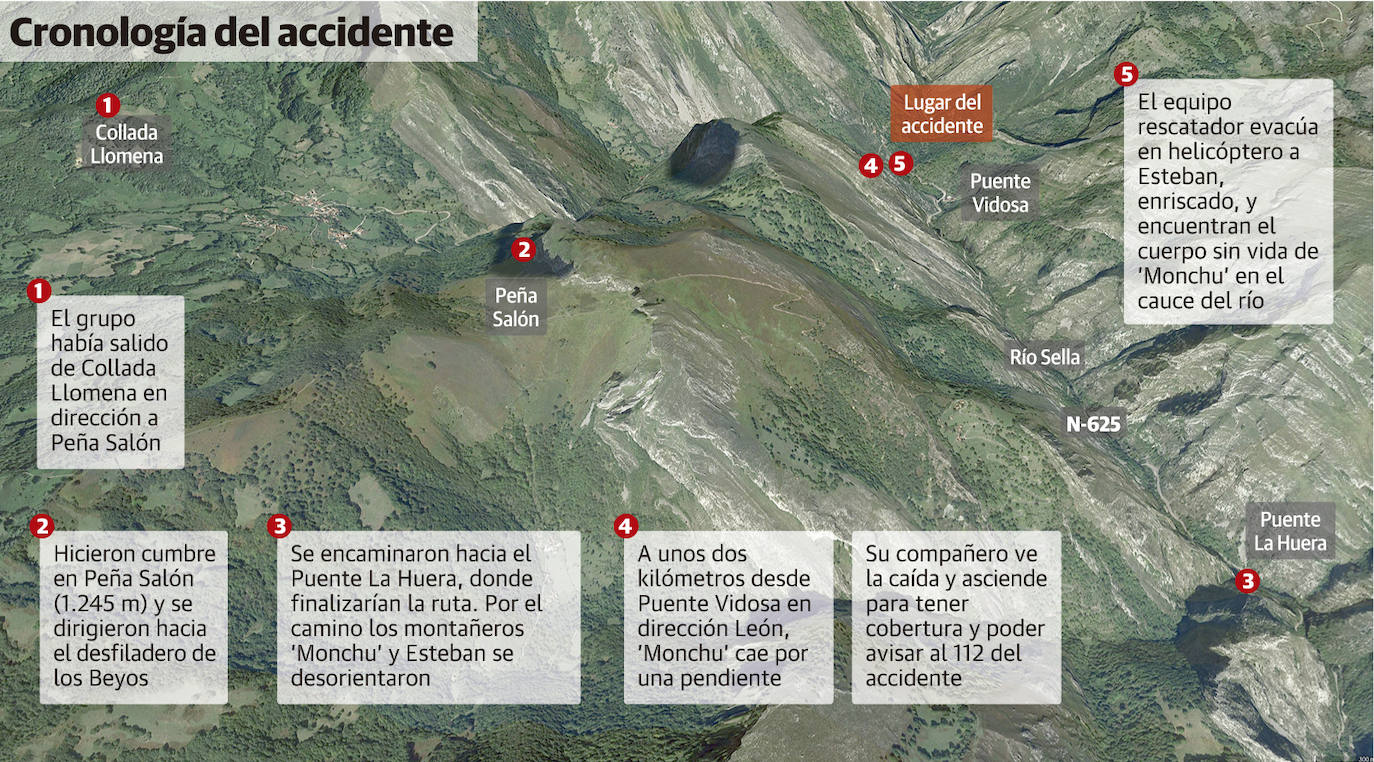 Miguel Nava, presidente de la agrupación montañera, explica que «'Monchu' era prudente, conocía la montaña y era una persona experimentada, pero un accidente le puede ocurrir a cualquiera, es una fatalidad...». Esteban, el otro integrante del grupo que se encontraba con él cuando se produjo la caída en el desfiladero de los Beyos, «está en shock». «Iba caminando detrás de 'Monchu', separados del grupo, se habían quedado atrás, y en un momento dado vio cómo caía rodando por la pendiente, ya no pudo hacer nada... Lo que hizo fue subir para arriba para buscar un sitio donde tuviese cobertura y poder llamar al 112, fue ahí cuando él se quedó enriscado», relata Miguel Nava.
