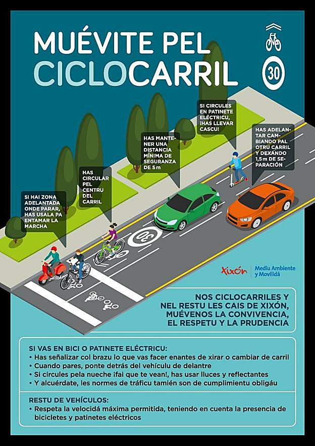 También se han editado 1.000 carteles en castellano y otros tantos en asturiano referidos a esta campaña, que se repartirá por centros deportivas, escolares y en comercios de las calles por donde pasan los ciclo carriles.