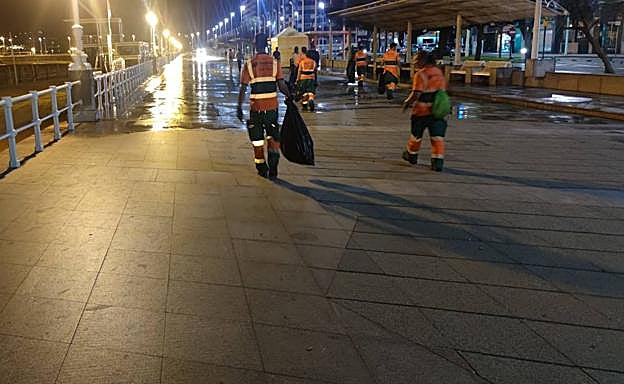 Durante la noche y a primera hora de esta mañana, los operarios de Emulsa recogieron 315 toneladas de basura, a falta de los resiudos que se generen tras el Restallón. Se hizo limpieza: playa y paseo San Lorenzo más el papeleras selectiva