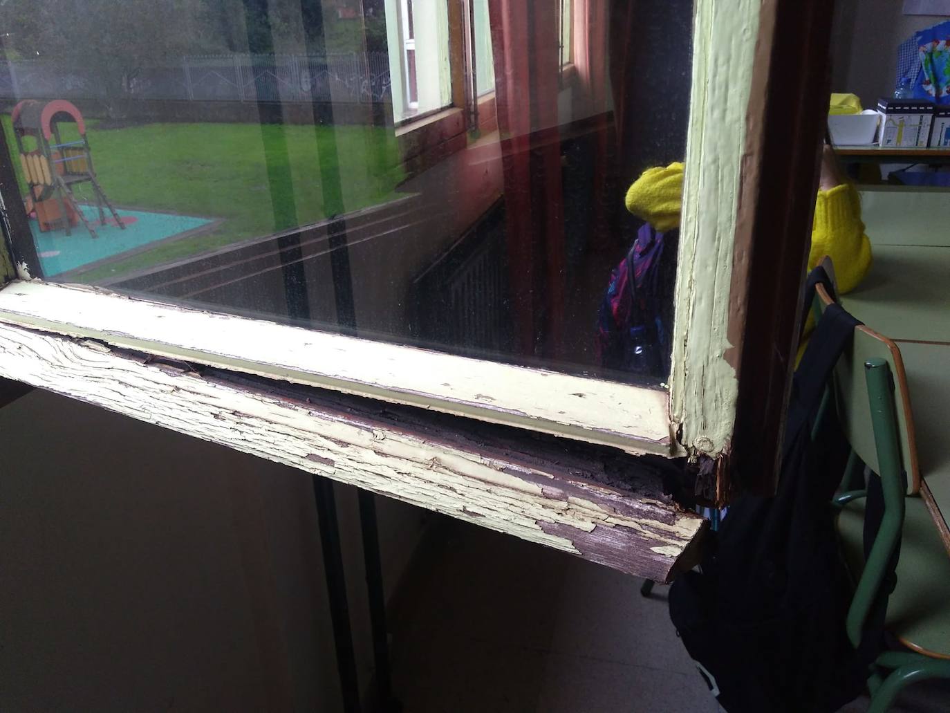 Una de las reivindicaciones de la Asociación de Padres y Madres de Alumnos es la necesidad de cambiar las ventanas de madera del colegio. Los nuevos acontecimientos parecen precipitar la urgencia de dicho cambio porque una de las ventanas se ha desprendido de su marco.