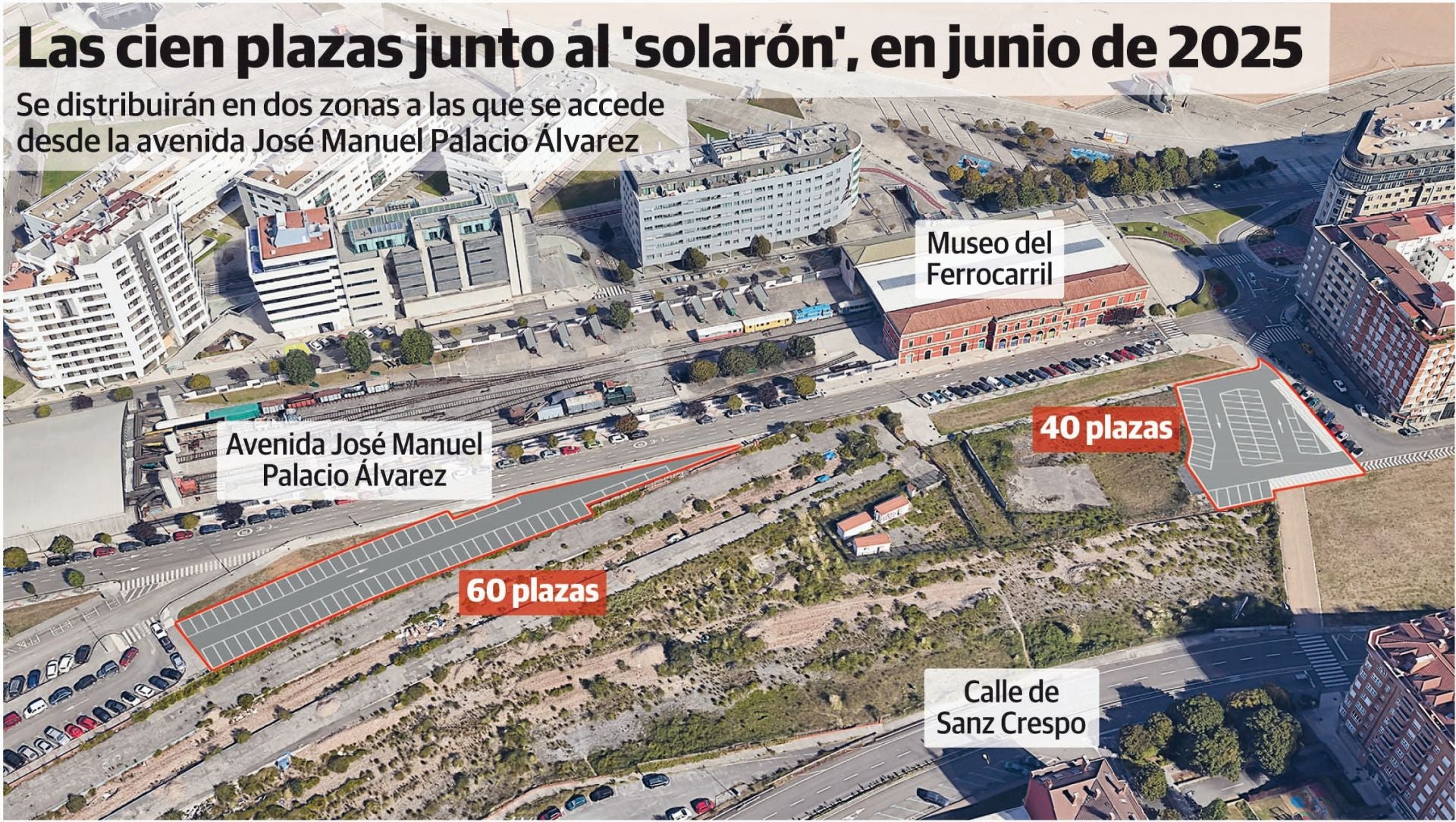 Por otra parte, deberán esperar hasta junio de 2025 los vecinos y trabajadores del centro, Laviada, Poniente y El Natahoyo para disponer del parking disuasorio de 100 plazas de zona azul que el equipo de gobierno prometió, en septiembre de 2023, construir entre el 'solarón' y el Museo del Ferrocarril. Sesenta de las cien previstas se ubicarían en una parcela longitudinal en la avenida de José Manuel Palacio que está situada entre la zona exterior del Museo del Ferrocarril y las antiguas vías. Las cuarenta restantes, muy próximas, estarían a la altura del edificio principal del Museo del Ferrocarril. Estas parcelas, cabe destacar, fueron utilizadas ilegalmente como estacionamiento por decenas de conductores durante los meses de julio y agosto, sin que la Policía Local impusiera siempre sanciones a los vehículos estacionados.