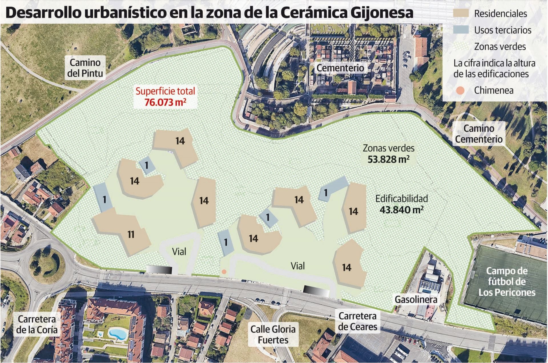 El arquitecto Patxi Mangado (Estella, 1957), Premio Nacional de Arquitectura y Medalla de Bellas Artes, es el autor del potente proyecto residencial ... que promueve el fondo inversor europeo Ginkgo en los terrenos de la antigua Cerámica Gijonesa, en Ceares. Un desarrollo urbanístico, adelantado en exclusiva por EL COMERCIO, que generará casi 400 nuevos pisos, repartidos en ocho bloques de entre 11 y 14 plantas, de los que un 30% serán viviendas de protección. A estas construcciones se sumarán varias de planta baja destinadas a usos terciarios como comercio u hostelería (también habrá locales en los bajos de los edificios residenciales). Y todo ello además creará un gran parque de 53.828 metros cuadrados en una operación que incluirá como hito la recuperación de la pendiente original de la ladera desde el parque de Los Pericones hasta la carretera de Ceares.