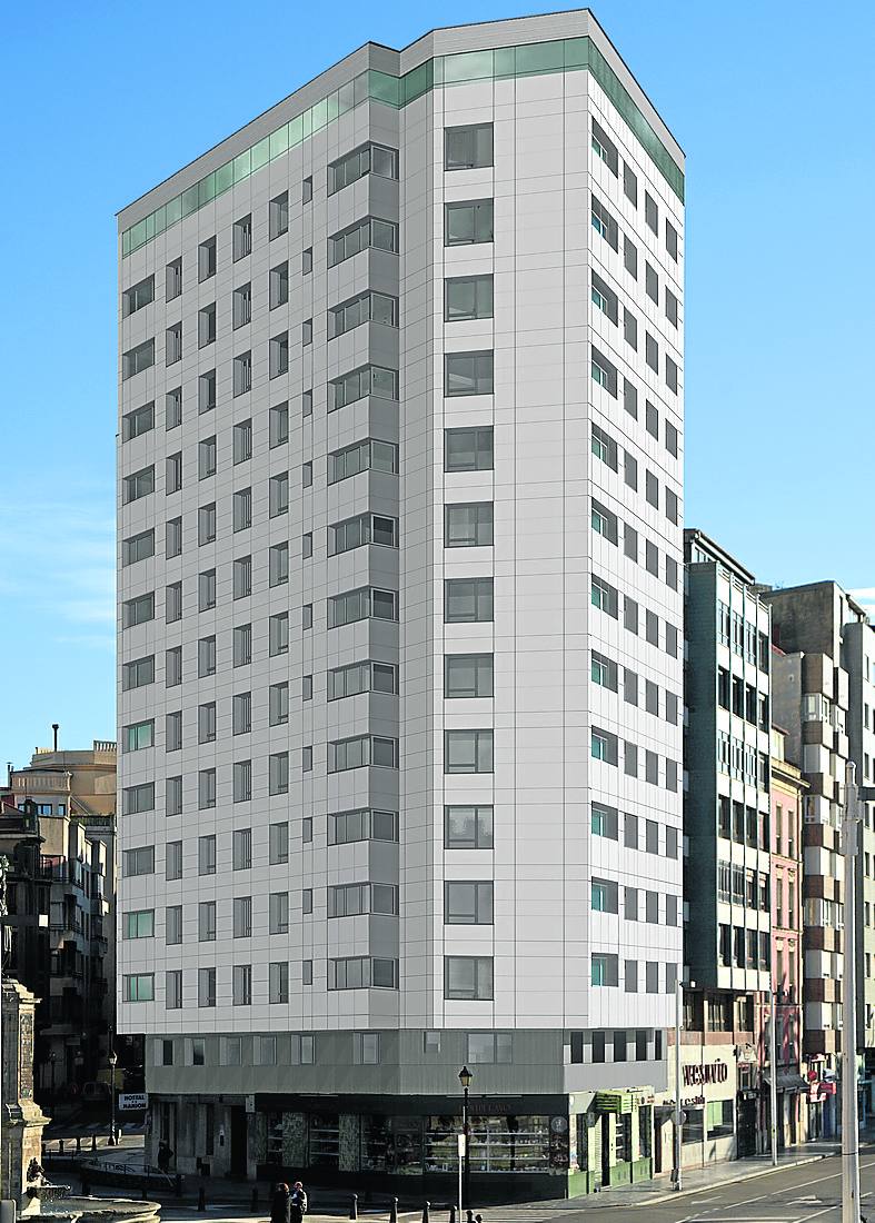 La plaza del Marqués continuará con el lavado de cara en altura que inició hace casi una década con la rehabilitación del edificio Rey Pelayo. El estudio de arquitectura de Jorge Noval y la empresa Esfer volverán a trabajar en equipo para remozar integralmente en esta ocasión la fachada de la segunda torre que escolta a la estatua de Pelayo, el edificio La Barquera, que también tiene 15 plantas.