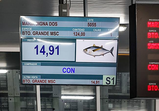 Se subastaron trece tinas (de unos 120 kilos) de bonito grande, que se rularon entre los citados 14,91 y los 11 euros, así como otras 90 de mediano o recortado, entre 8,58 y 4,60 euros; diez de monos, entre 5,15 y 2,94 euros, y unas pocas de bonitas (bonito patudo) y bonito listado.