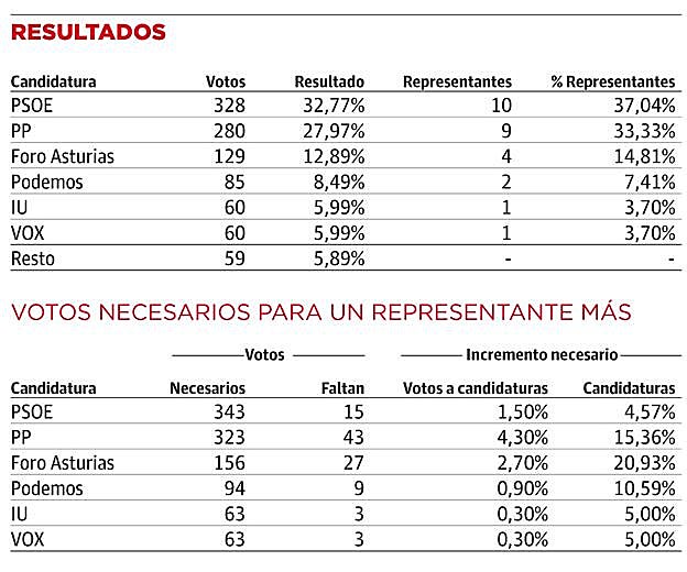 La izquierda pierde su mayoría; el PP triplica sus concejales, Foro sube, Vox baja a uno, y Ciudadanos desaparece