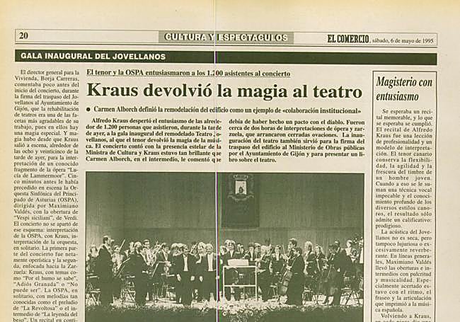 En 1987 cerró sus puertas y dos años después se aprobaba su expropiación para convertirlo en teatro público. Antes de la gran obra de reforma que habría de llegar en 1993 y se prolongó durante dos años, algunas chapuzas permitieron que el teatro estuviera activo. Miguel Rodríguez Acebedo era quien estaba entonces al frente del espacio que un 5 de mayo de 1995 abría sus puertas con la actuación estelar de Alfredo Kraus y la presencia de la ministra Carmen Alborch. «Kraus devolvió la magia al teatro», titulaba este periódico en una crónica firmada por J. J. Medina, que sirve hoy para recordar que el alcalde era Vicente Álvarez Areces y que 1.200 personas fueron partícipes de esa bienvenida a un icono de la cultura gijonesa. Sonaron Verdi, Donizetti, Bellini, Gounod junto a Chapí y Vives. «Recuerdo que había una ilusión enorme», rememora Rodríguez Acebedo, que tiene presente en la cabeza aquel año especial en el que después de Kraus llegaron el histórico pianista Gonzalo Rubalcaba, el gran Marcel Marceau o el inolvidable Lindsay Kemp en una programación de escándalo. «La gente estaba encantada de la vida, eufórica, había entonces muchas cosas en Gijón, grandes conciertos, y nosotros alquilábamos salas para hacer actuaciones, pero el público estaba esperando ese rincón, fue la locura, tenía ganas de ir al teatro, aquello fue una fiesta». Anoche sonó también la zarzuela en un teatro que mañana abrirá sus puertas de una manera muy especial. De cuatro a nueve de la tarde, se recordarán los treinta años con una proyección de fotografías en el propio teatro. Habrá también otra oportunidad de celebración más adelante a través una función especial del ciclo Encajados que se hará en tres zonas distintas del teatro, el local de ensayos, la caja escénica y el foso. Eso sucederá el día 18 de mayo en varios pases. Habrá en verano, además, visitas teatralizadas.