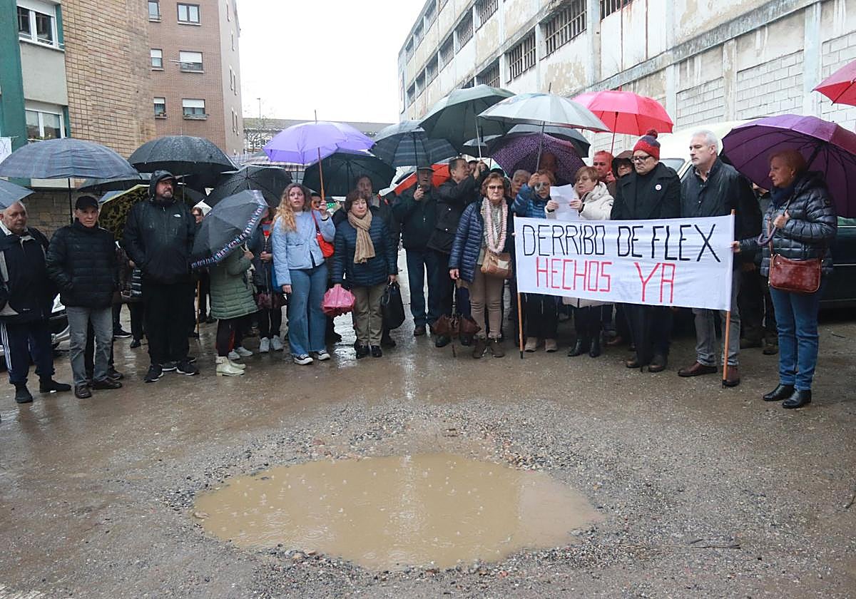 Junto a una pancarta que rezaba: «Derribo de Flex. Hechos ya». Los vecinos indicaron que no quieren «más palabras vacías». Así lo expresó Inmaculada Batalla, que vive frente al abandonado edificio y lleva sufriendo este problema desde que cerró la fábrica en 2001. «Es un estercolero», criticó.
