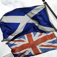 Las banderas de Escocia y del Reino Unido ondean en Gretna, frontera con Inglaterra.