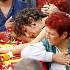 Familiares lloran sobre el ataud de una víctima del atentado.