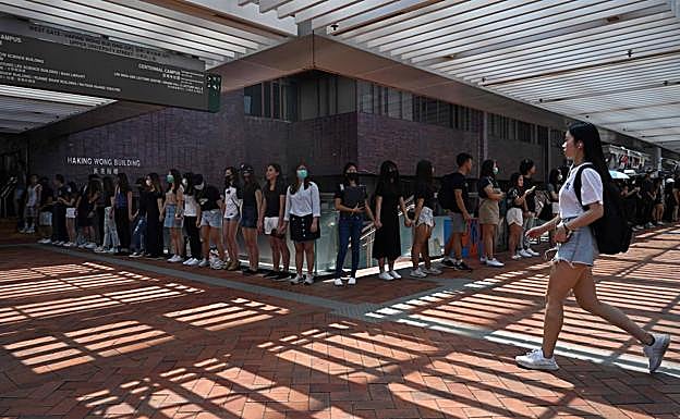 Cientos de estudiantes de secundaria, muchos de ellos vestidos con uniformes y máscaras, han formado este lunes cadenas humanas en varios distritos de Hong Kong para apoyar a los manifestantes antigubernamentales, tras otro fin de semana de enfrentamientos entre la Policía y los manifestantes.