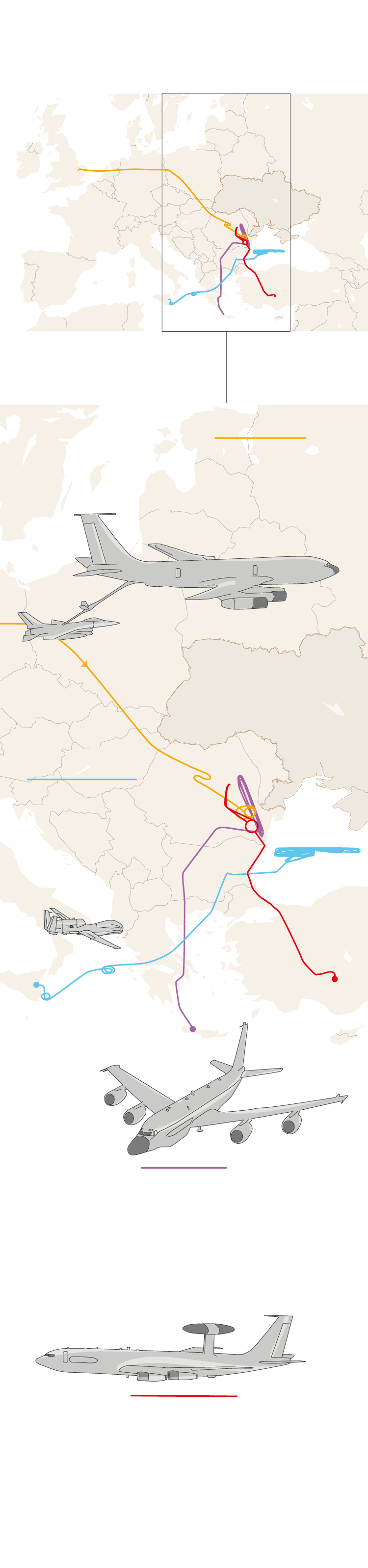 De forma casi rutinaria, el dron despega a primeras horas de la mañana de la base de la OTAN de Sigonella, en la isla italiana de Sicilia, sobrevuela Grecia, Bulgaria y Rumanía, gira hacia el Este y comienza a orbitar sobre las aguas del mar Negro. Su vuelo le acerca a unos cien kilómetros de Sebastopol, en la península de Crimea. Dentro de las distintas rutas de los aviones espía, esta es una de los más delicadas puesto que se coloca no muy lejos de una región de Ucrania que se declaró independiente de forma unilateral en 2014, para unirse a Rusia de forma inmediata. Ni Kiev ni la mayoría de la comunidad internacional reconocen su soberanía.