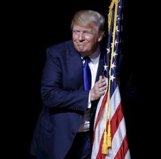 Donald Trump abrazando una bandera de EEUU.