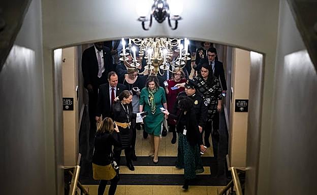 En las horas previas a la esperada llegada al Senado, el proceso de destitución del presidente de Estados Unidos se calienta. Al presentar a los siete legisladores demócratas que actuarán como fiscales en el 'impeachment' contra Donald Trump a partir del martes, la líder de la Cámara de Representantes, Nancy Pelosi, habló de «proteger y defender nuestra Constitución para buscar la verdad para el pueblo estadounidense». Pero lejos de acudir a los padres fundadores de la nación, echó mano de la película 'El irlandés' de Martin Scorsese para explicar por qué el mandatario debería abandonar con deshonor la Casa Blanca.