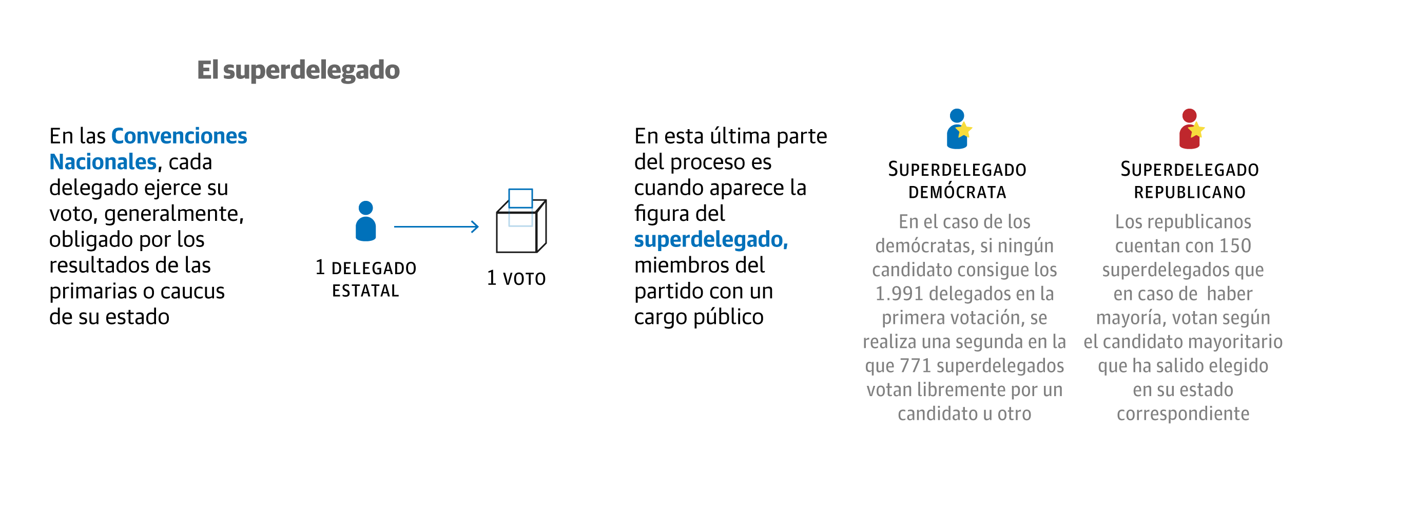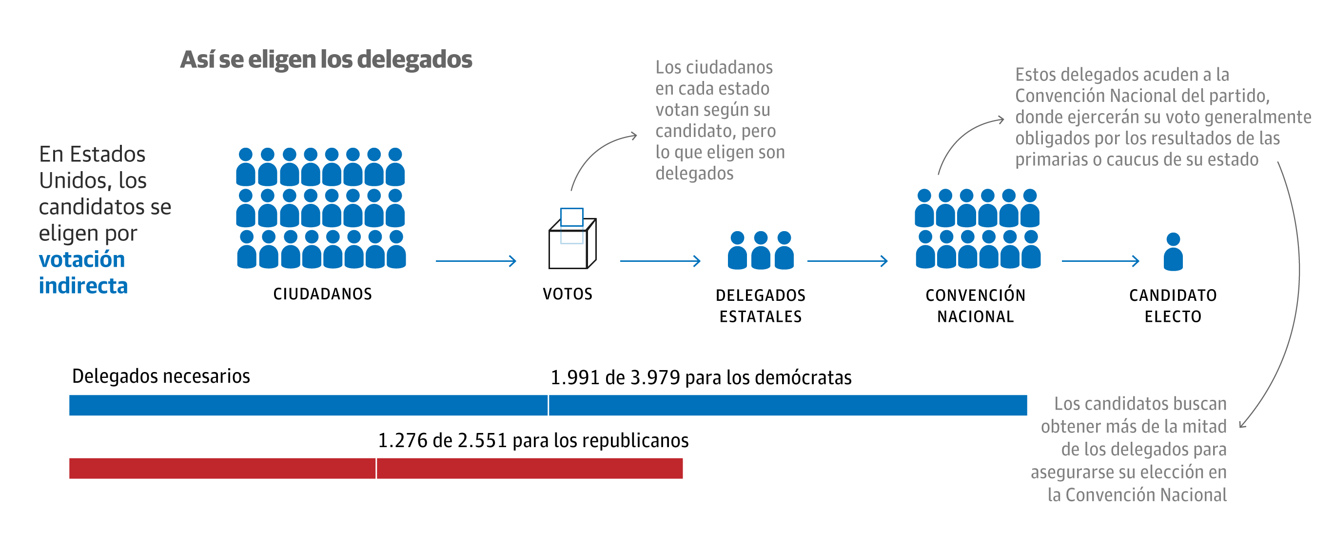 En el proceso de primarias o caucus que se realizan en cada estado, se designan a los delegados, que son quienes acuden después a la Convenció́n Nacional de su partido para emitir sus votos, generalmente obligados por los resultados previos.