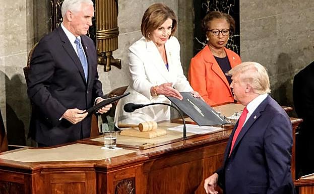 Prueba del enconamiento político que separa más que nunca al poder ejecutivo del legislativo fue la danza de gestos groseros que intercambiaron Trump y Pelosi este miércoles por la noche, durante el tercer discurso sobre el estado de la Unión que da el presidente. Al llegar le dio la espalda a la portavoz del Congreso cuando esta le tendió la mano. Ella le devolvió la ofensa ahorrándose la pompa de presentarle ante la Cámara con «el alto privilegio y distinguido honor» de costumbre. «Ante ustedes, el presidente de EE UU», atajó con sequedad.