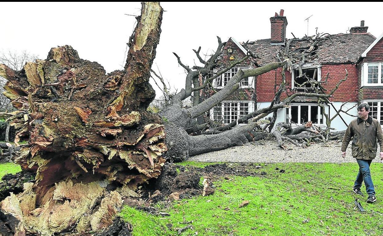 Un hombre pasa junto a un gran árbol que ha caído sobre su hogar en Brentwood, Reino Unido, por las fuertes lluvias. E.P./ Vídeo: Atlas