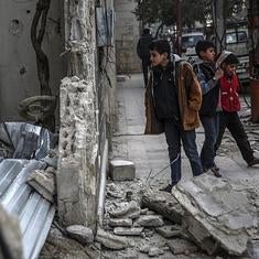 Curiosos inspeccionan los restos tras un ataque aéreo.