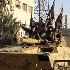 Yihadistas del Estado Islámico desfilan con sus tanques por una calle de Raqa.