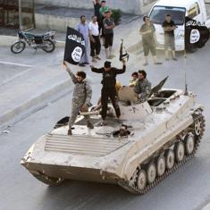 Yihadistas leales al Daesh desfilan en un tanque por la ciudad siria de Raqqa.