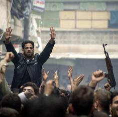 Rebeldes del Ejército Libre de Siria participan en una manifestación en un barrio de Alepo.