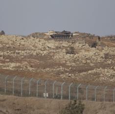 Rebeldes sirios junto a un tanque en la valla fronteriza próxima a la ciudad de Jubata, en Siria.