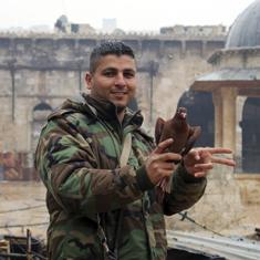 Un soldado sirio hace el símbolo de la victoria junto a la mezquita de Umayyad, en el este de Alepo.