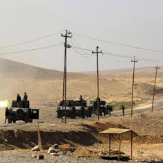 Soldados iraquíes prueban su armamento antes del ataque en Mosul.