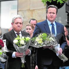 El primer ministro británico David Cameron (d), y el presidente de la Cámara de los Comunes británica, John Bercow (i) depositan flores donde asesinaron a la diputada laborista Jo Cox.