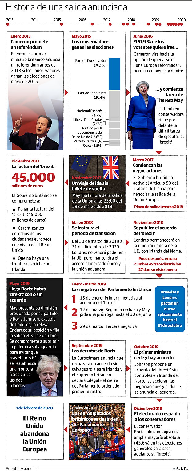 ¿Y cómo será la relación futura? El Ejecutivo comunitario (el propio Barnier) presentará el próximo lunes las directrices que van a marcar esas negociaciones, que deberían resolverse en poco más de diez meses. A Bruselas no le salen las cuentas con el plazo. Ejemplos, sobran: el CETA (acuerdo de libre comercio con Canadá) requirió 7 años y Mercosur (con Argentina, Brasil, Paraguay y Uruguay), dos décadas. Y hace ya tiempo que sospecha que el hecho de que Boris Johnson no esté dispuesto a prorrogarlo (hasta dos años permite el Acuerdo de retirada) se siente como unas maniobra de presión a la que Bruselas no se plegará.