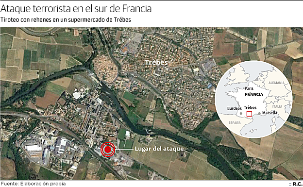 «Robó primero un automóvil en Carcasona, mató a un pasajero e hirió al conductor». Un poco más lejos, disparó e hirió levemente a un policía que volvía de correr con otros agentes cerca de un cuartel. Unos minutos más tarde, hacia las 11:15 horas, penetró en un supermercado de Trebes, a menos de diez kilómetros de Carcasona, y «mató a otras dos personas», un empleado y un cliente. En el interior, retuvo a una mujer, mientras otros rehenes consiguieron huir.