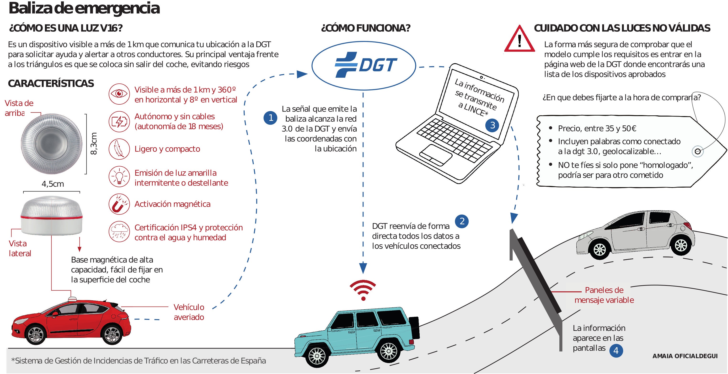 Si aún no la tienes quizás debas poner en tu carta a los Reyes Magos la baliza V16. Sí esa que será obligatoria a partir de enero y que está generando una gran polémica, sobre todo en redes sociales. Algunos usuarios critican que la luz que emite el dispositivo no tiene la suficiente intensidad para que sea vista con cierta distancia sino que es cuando estás de cerca cuando se aprecia que está encendido. Sea como fuere lo que hay que tener claro es que debemos sí o sí llevar esta baliza en nuestro coche y activarla en caso de que circulando por carretera nos ocurra alguna avería o accidente. Por eso es imprescindible que la baliza que tengamos esté homologada. Y para saber si es así hay que fijarse en dos aspectos, tal y como aclara la Dirección General de Tráfico.
