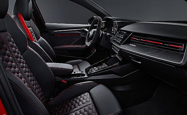 En el interior, cuenta con un cambio de marcha específico con visualizaciones propias en el cuadro de instrumentación digital Audi virtual cockpit plus (de 12,3 pulgadas). Dicho cuadro digital, por cierto, muestra las revoluciones en forma de gráfico de barras y , en porcentajes, la potencia y el par motor. El volante RS Sport, de tres radios, cuenta además con un botón específico para acceder a las prestaciones del RS Mode.