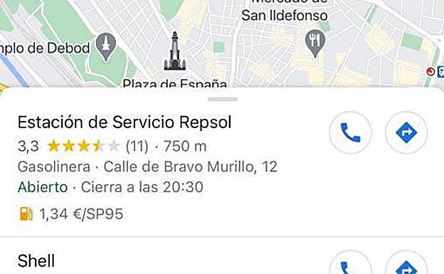 Si se 'pincha' encima de una en concreto, bajo los iconos de Indicaciones, Llamadas, Guardar y Compartir, la herramienta de Google le mostrará toda la información sobre los precios de los combustibles que se ofrecen en la estación. Es decir, tanto de Super 95, como de 98, diésel, gasóleo o gas licuado de petróleo.