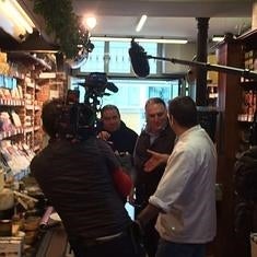 El conocido chef José Andrés acudió ayer a la tienda y espacio gastronómico Aramburu, en la calle Fierro, 9, junto a El Fontán, para rodar, junto a su propietario, Roberto Aramburu, material para un programa televisivo especial con el que dar a conocer la gastronomía asturiana y los productos de calidad que la hacen posible.
