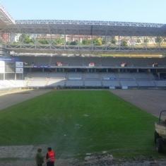 Los técnicos de la empresa Green Natur Césped Deportivo retiraron los tepes de hierba natural del estadio, que ahora guardan en El Requexón, para que posteriormente comiencen los trabajos en las capas inferiores
