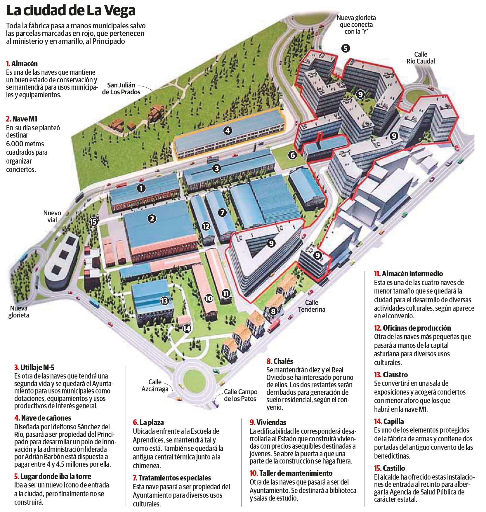 El Ayuntamiento ahora es el propietario mayoritario de los 120.000 metros cuadrados, considerados un «espacio de oportunidad». Tendrá a su disposición treinta edificaciones que suman más de 31.000 metros cuadrados, mientras que el Principado se ha comprometido a la compra de la nave de cañones por 4,5 millones euros y Defensa explotará los espacios que serán destinados a viviendas, que serán principalmente para jóvenes y con precios asequibles, aunque se abre la puerta a que sea en otras parcelas fuera del recinto.